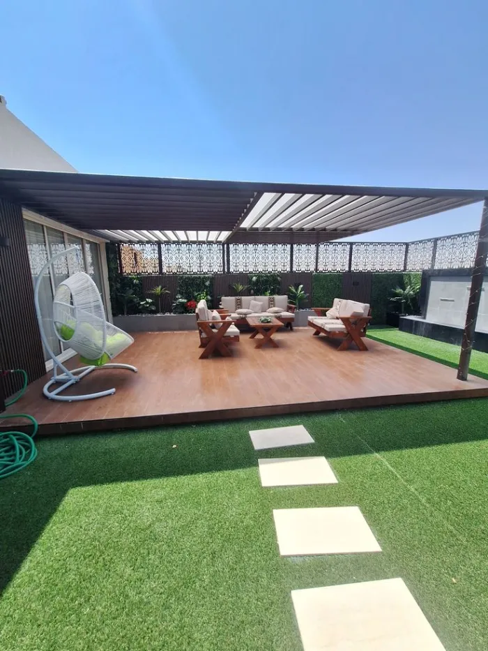 إضافة جلسات خشبية تحت البرجولة مع إضاءة ليلية هادئة.
