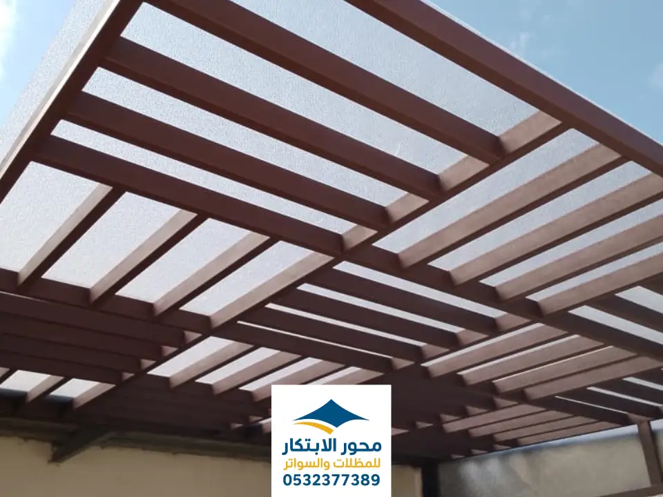- مظلات استراحة بولي كربونيت (Polycarbonate) خيار ممتاز لمن يبحث عن دخول إضاءة طبيعية مع حماية من الشمس، ويُستخدم كثيرًا في مداخل الاستراحات أو مناطق الممرات.