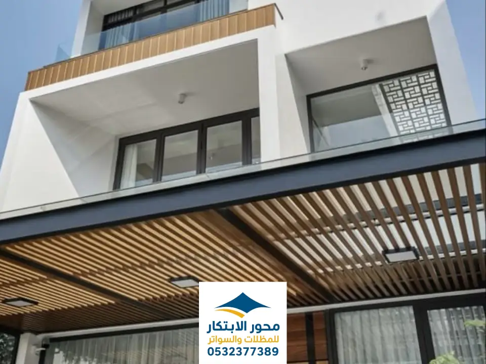 - مظلات استراحات خشبية أو بديل الخشب (WPC / ألمنيوم بتشطيب خشبي) خيار جمالي جدًا في الاستراحات الفاخرة، ويظهر كثيرًا في تصاميم مظلات استراحات الرياض الحديثة.