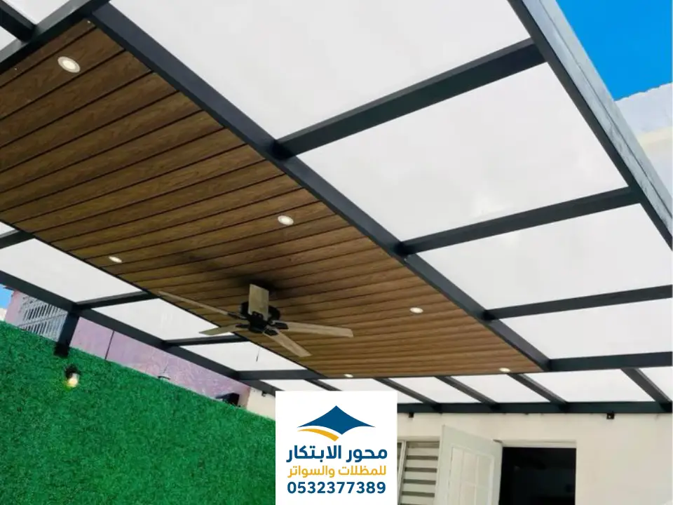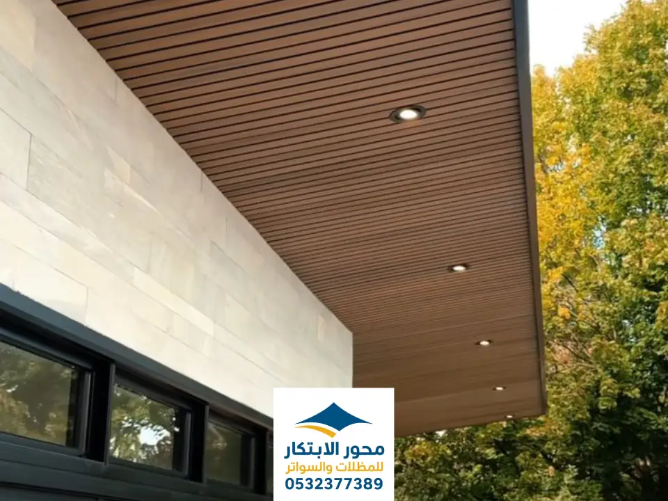 - المظلات بديل الخشب المعلقة (بدون أعمدة): تُثبت هذه المظلات باستخدام كوابل صلبة وجسور حديدية مخفية مباشرة في الجدار، مما يوفر مساحة واسعة تحت المظلة ويسهل حركة السيارات داخل الحوش .